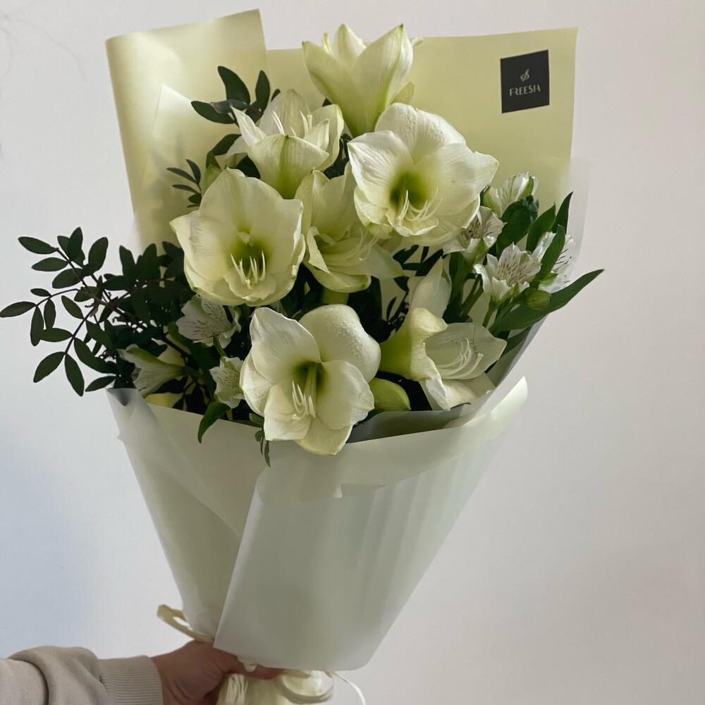 Альстромерия – 2 шт.Фисташка пучок – 2 шт.Дизайнерская упаковка – 1 шт.амариллис микс – 3 шт.