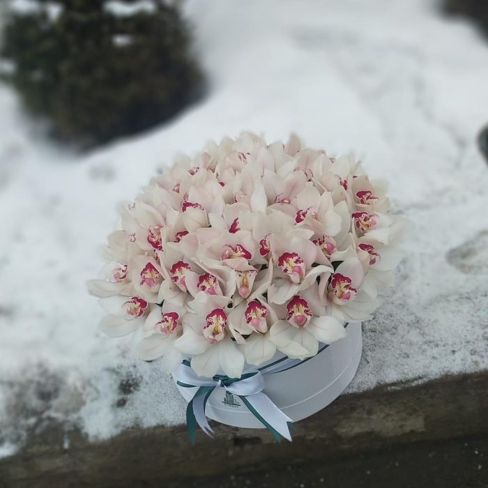Лента атласная – 1 шт.Коробка шляпная – 1 шт.Оазис флористический – 3 шт.Цимбидиум белый – 45 шт.