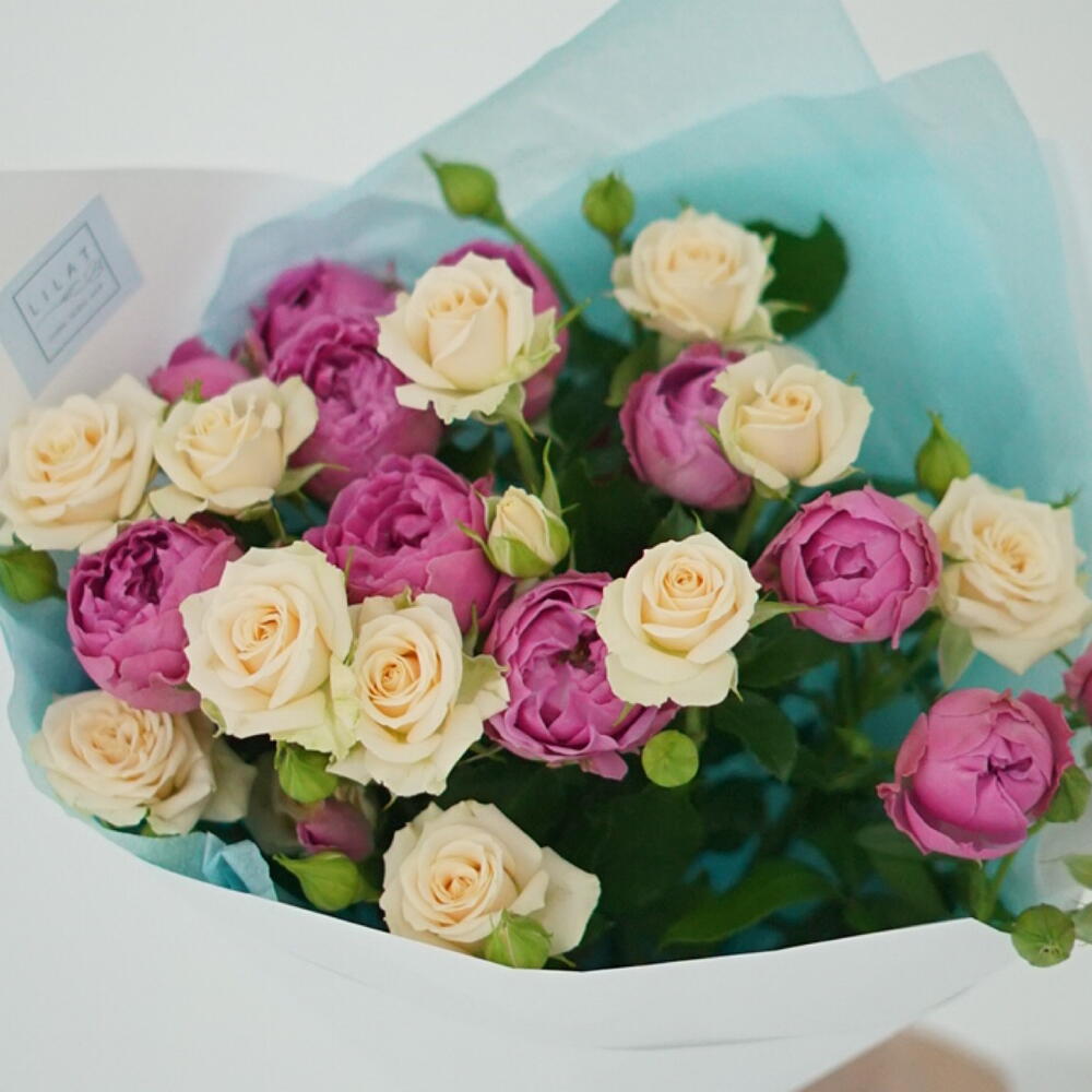 packaging design – 2 шт. gift message card – 1 шт. peony spray rose – 3 шт. free delivery – 1 шт. care instruction – 1 шт. spray rose cream – 4 шт.