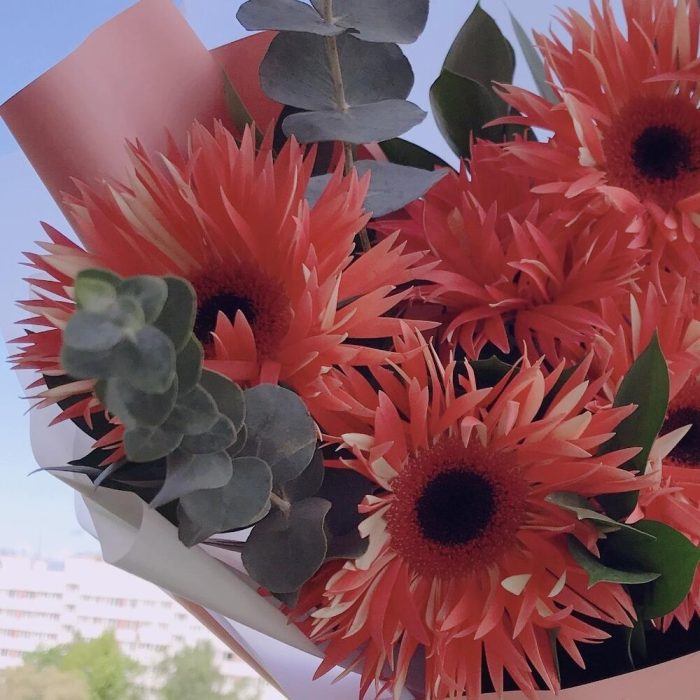 Очаровательный букет из изысканных свежих цветов.В составе: махровые гебреры, эвкалипт, рускусБукет цветов — обязательный презент для прекрасной половины человечества. Это красивый способ сделать женщину счастливой.Чтобы букет радовал дольше необходимо:❤ Ставить его в прохладном месте, избегая отопительных приборов и прямых солнечных лучей. ❤ Наполнить вазу большим количеством воды. ❤ Как можно чаще освежать срез и воду. Почему выбирают нас? – Работаем на качество. – В подарок к каждому букету витамины для цветов. – Бережно упакуем в транспортировочную пленку, чтобы защитить во время доставки от любых погодных условий. – Приложим инструкцию, как правильно ухаживать за цветами.Сохраняйте товар в подборках, чтобы не потерять