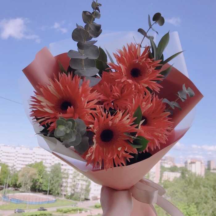 Рускус – 1 шт.Эвкалипт – 1 шт.Лента атласная – 1 шт.Упаковка дизайнерская – 1 шт.инструкция по уходу за цветами – 1 шт.любовь флориста – 1 шт.махровая гербера – 5 шт.витамины для цветов – 1 шт.