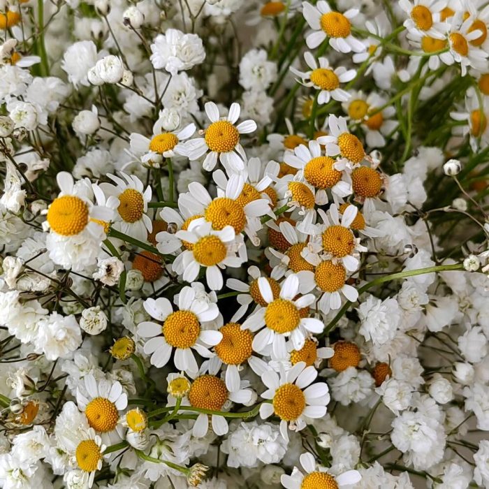 Лента атласная – 3 шт.Ромашка кустовая – 7 шт.Упаковка дизайнерская – 3 шт.гипсофила белая – 5 шт.