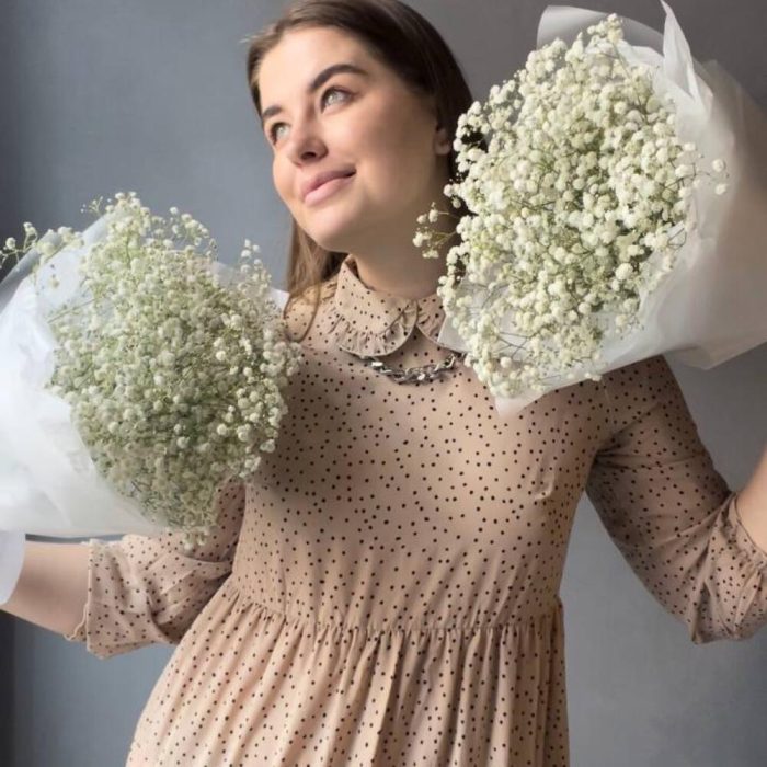 Лента атласная – 2 шт.Пленка дизайнерская – 3 шт.гипсофила белая – 7 шт.