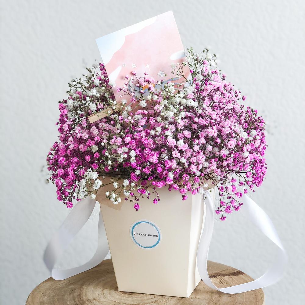 Гипсофила – 5 шт.Сумочка с ручками из плотного картона ламинированого – 1 шт.Губка флористическая – 1 шт.
