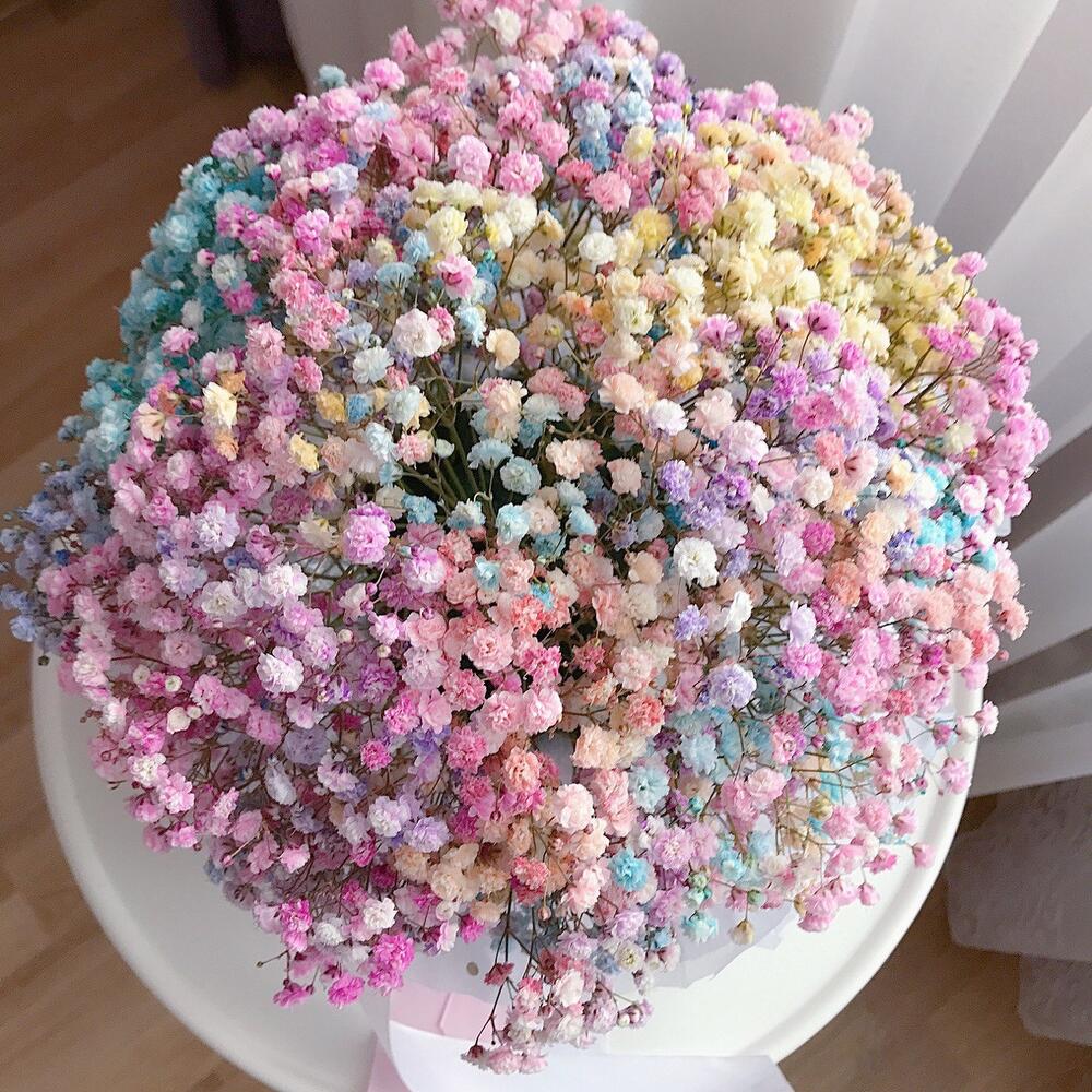 Радужная гипсофила в картонном цилиндре всегда популярна! Ее дарят в качестве подарка для маленькой девочки, на первое свидание, на День рождения жены или мамы! Разноцветные шарики поднимут настроение и украсят любой праздник. После высыхания радужная гипсофила превратится в сухоцветы и будет радовать любимого человека ещё долгое время Как ухаживать за цветами на флористической губке* Следите, чтобы флористическая губка всегда была влажной.* Ежедневно подливайте воду на губку между цветами.* Используйте только прохладную воду. Теплая или слишком холодная вода отрицательно сказывается на состоянии срезанных цветов.* Следите за тем, чтобы букет был вдали от сквозняков, прямых солнечных лучей, а также источников тепла (каминов, батарей). Также нежелательно ставить букет рядом с фруктами и овощами.