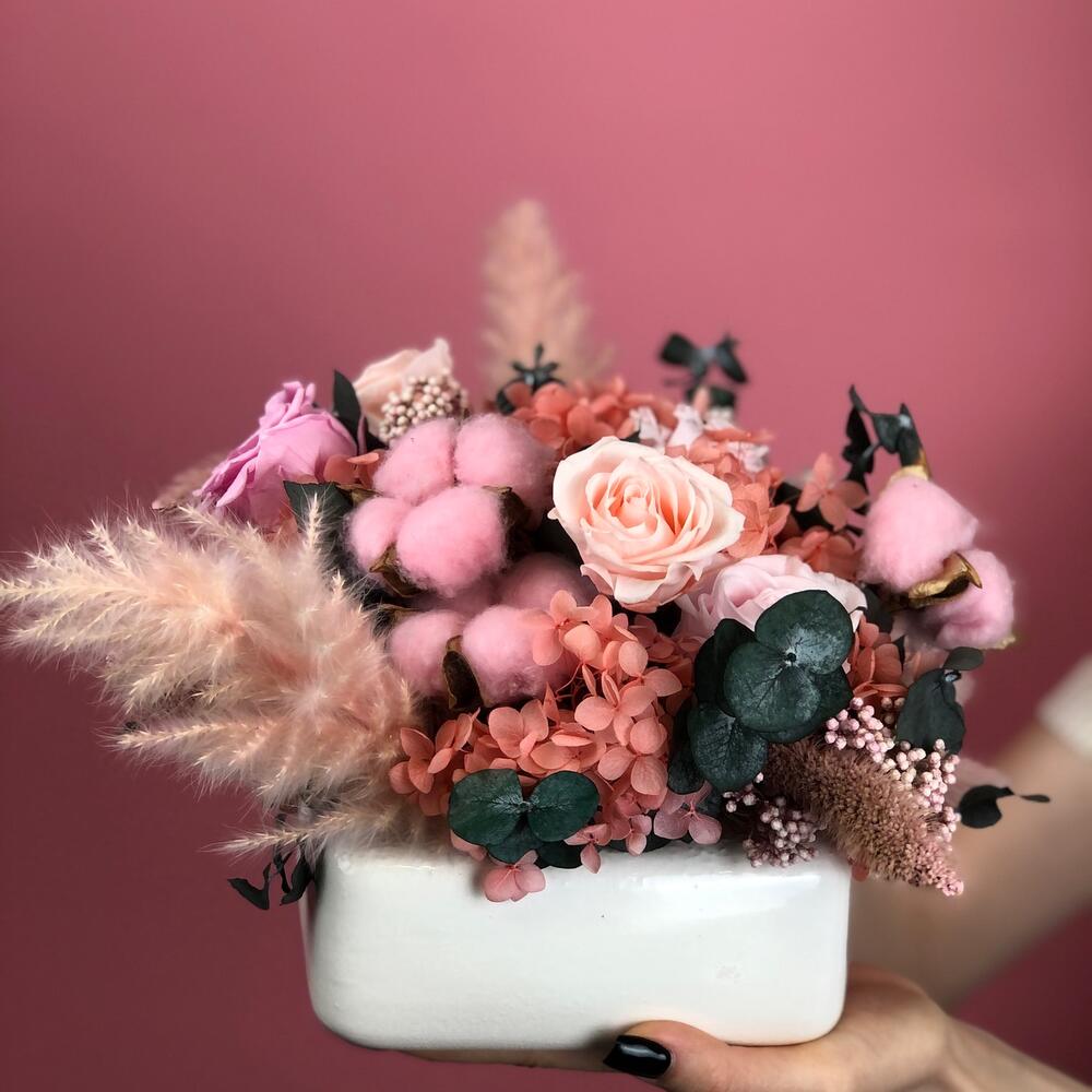 Хлопок – 5 шт.Керамическое кашпо – 1 шт.гортензия стабилизированная – 20 гр.рисовый цветок – 2 шт.стабилизированные цветы микс – 21 шт.