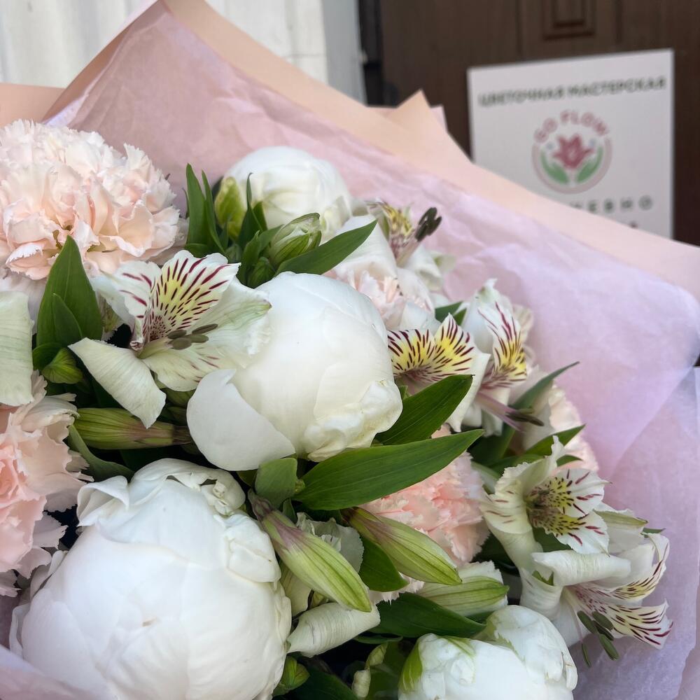 Альстромерия белая – 6 шт.Лента атласная белая – 1 шт.Диантус персиковый – 5 шт.Упаковка корейская пленка – 1 шт.пион белый премиум – 5 шт.тишью нежно-розовое – 1 шт.