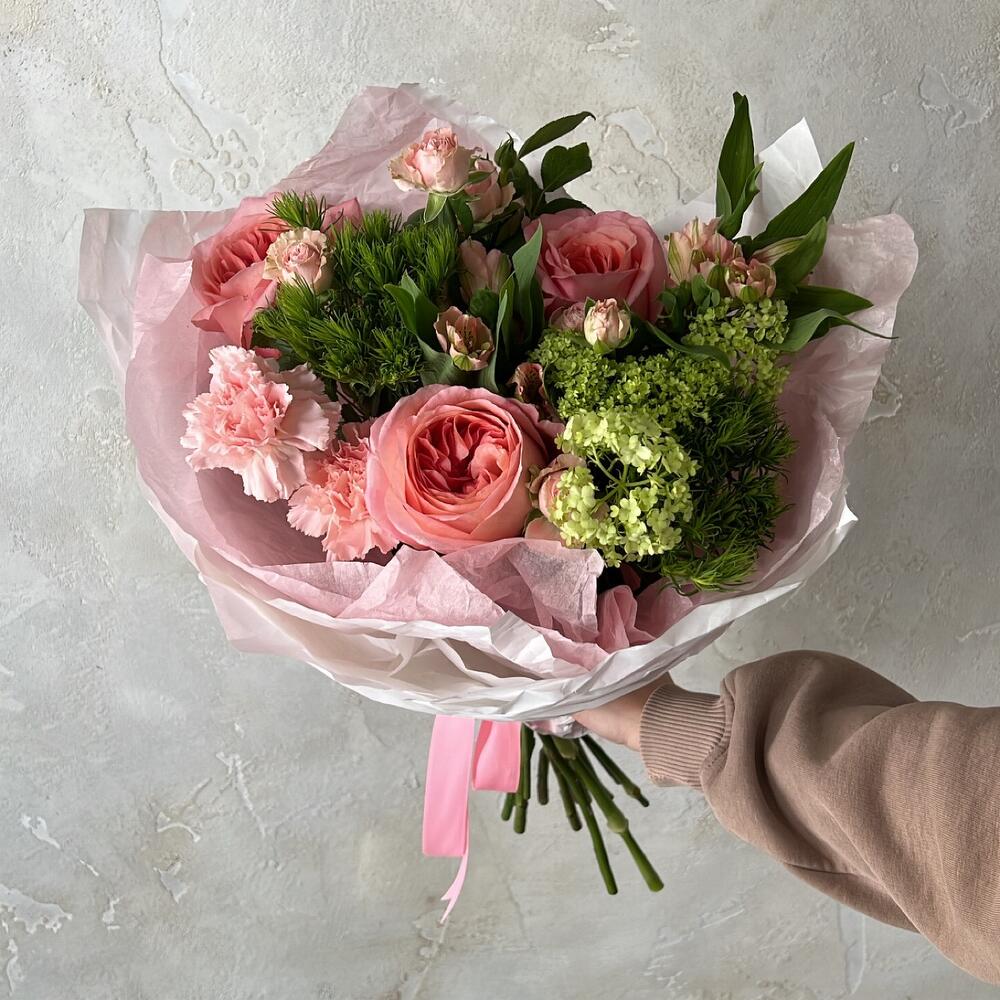 Дизайнерский букет с пионовидной розой, вибурнумом, альстромерией и гвоздикой