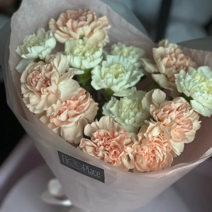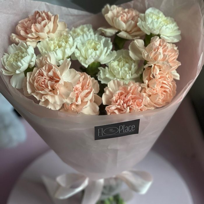 Диантус – 13 шт.Тишью белое – 1 шт.Пленка матовая – 1 шт.Лента атласная – 1 шт.