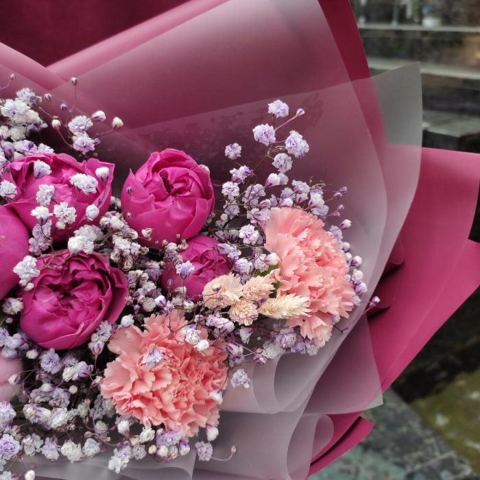 Гвоздика сортовая – 3 шт.Misty bubbles – 1 шт.Гипсофила – 1 шт.Хлопок натуральный – 1 шт.папоротник ветка – 1 шт.