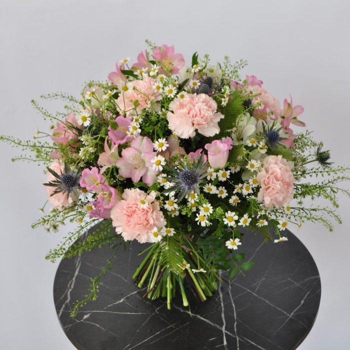 Ароматный букет с ромашками, колокольчиками и гвоздиками.Прелестные стойкие цветы слились в великолепном вальсе с голубыми колючками эрингиума, создавая непередаваемую атмосферу свободы, расслабления и счастья!Букет в европейском стиле, собран для вручения без упаковки!Будет красиво смотреться в вазе – круглый и нарядный со всех сторон!Истинная красота цветов для вашей ненаглядной.Доставим на воде и коробке, бережно и с заботой)