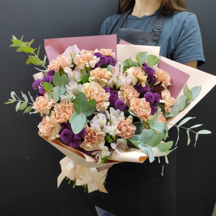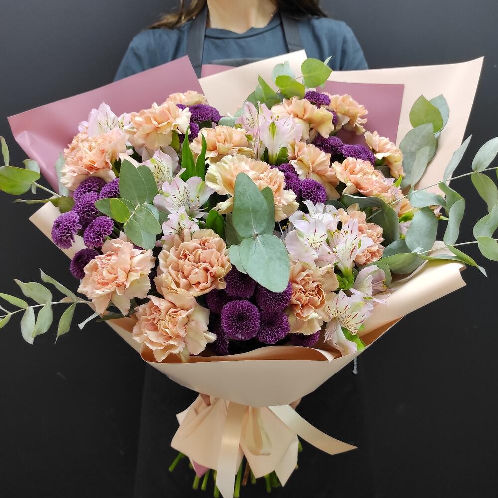 «Лавандовое созвездие» Букет из розы, гвоздики, статица и хлопка