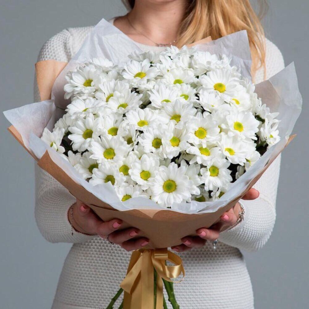 Упаковка – 1 шт.Атласная лента – 1 шт.Хризантема кустовая ромашковая белая – 9 шт.