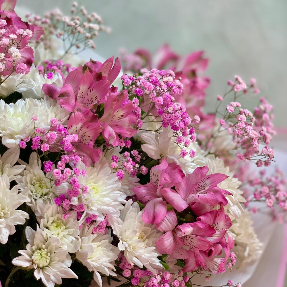Хризантема кустовая – 10 шт.Альстромерия – 5 шт.Гипсофила – 5 шт.Упаковка дизайнерская – 3 шт.