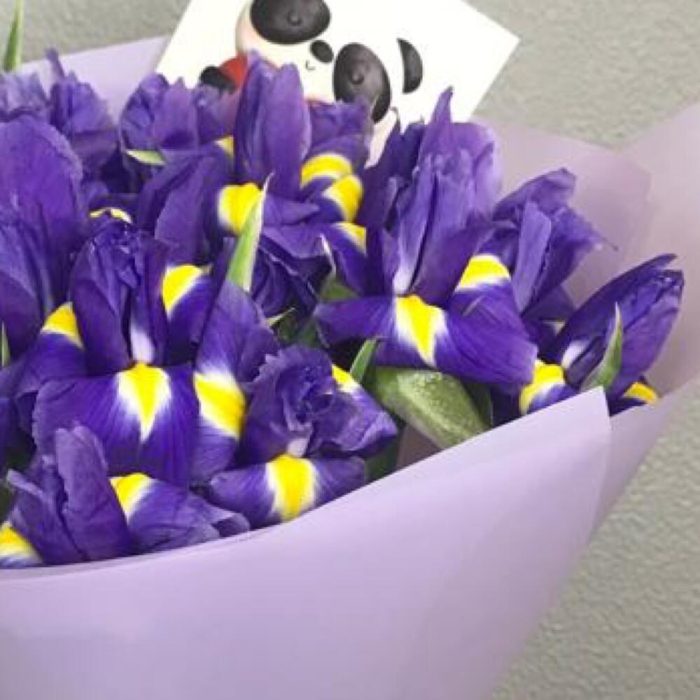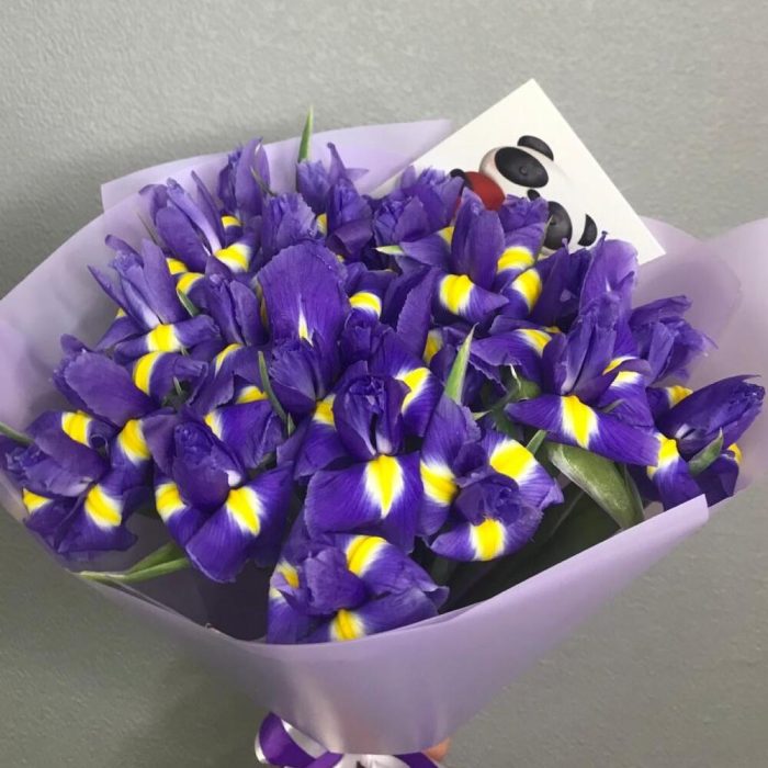 Ирис – 25 шт.Лента атласная – 2 шт.Фисташка – 4 шт.Открытка – 1 шт.Упаковка дизайнерская – 1 шт.