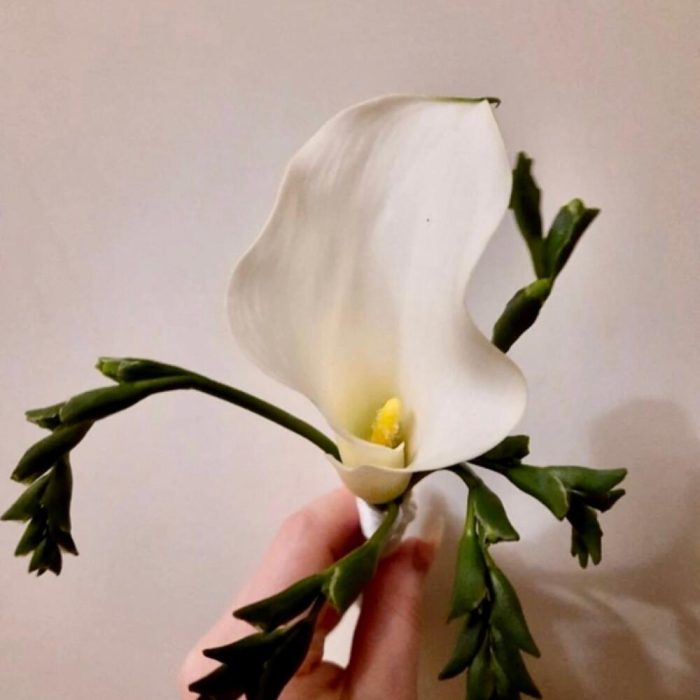 Лента атласная – 1 шт.Фрезия белая – 9 шт.Калла белая – 19 шт.бутоньерка для жениха – 1 шт.