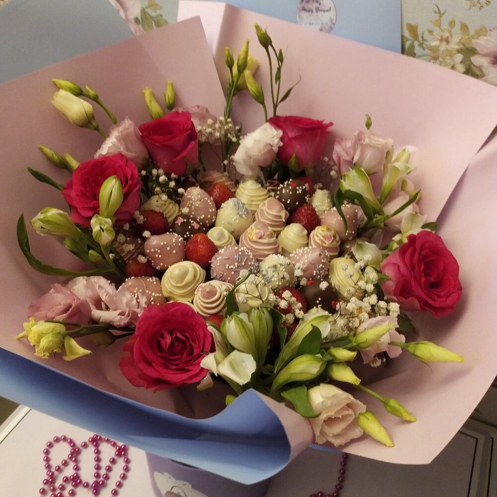 Альстромерия – 3 шт.Клубника – 8 шт.Лизиантус – 6 шт.Клубника в шоколаде callebaut (бельгия) – 30 шт.Дизайнерская упаковка – 1 шт.розы алые 60 см – 5 шт.