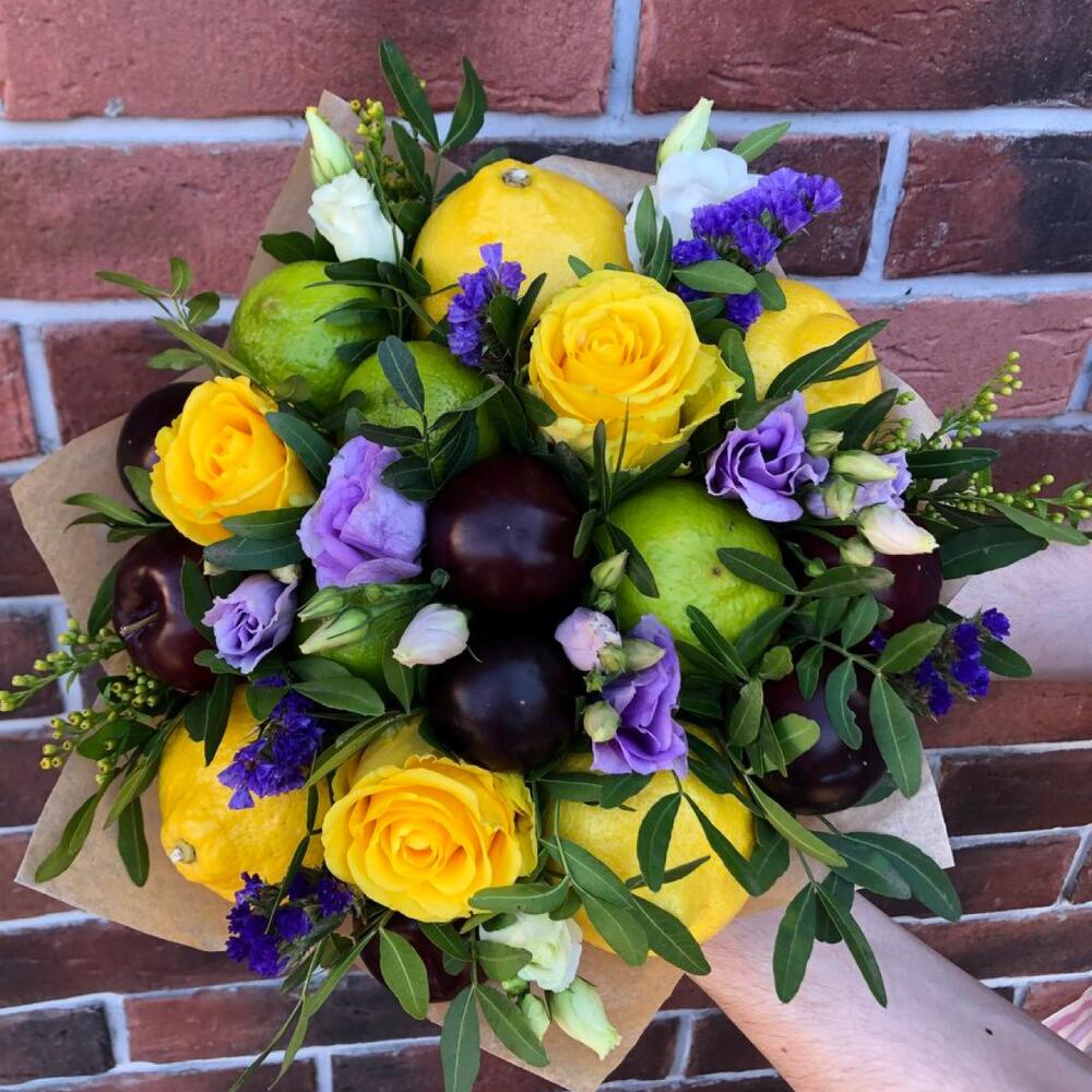 розы – 4 шт.лимоны – 6 шт.Лайм – 5 шт.Эустома – 9 шт.Статица – 8 шт.Слива – 8 шт.фисташка зелень – 3 шт.