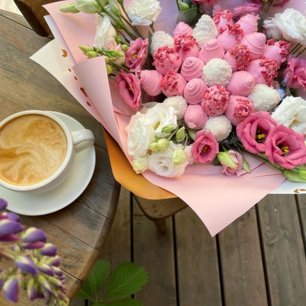 Клубника в шоколаде – 800 гр.эустома розовая и белая – 9 шт.