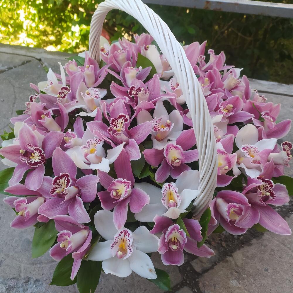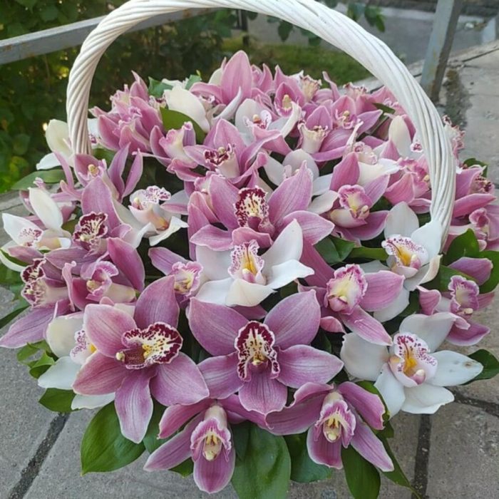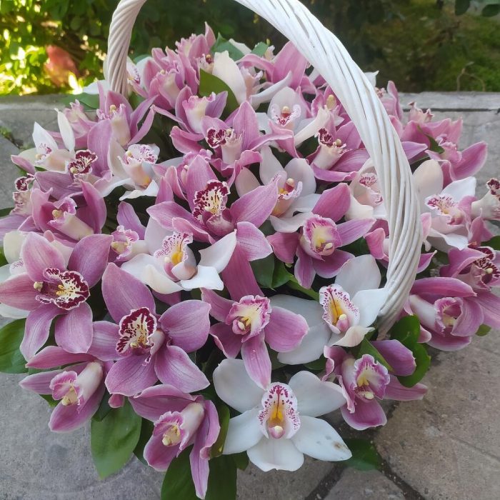 Орхидея Цимбидиум ветка – 3 шт.Корзина плетеная – 1 шт.зелень декоративная – 10 шт.Оазис флористический – 2 шт.