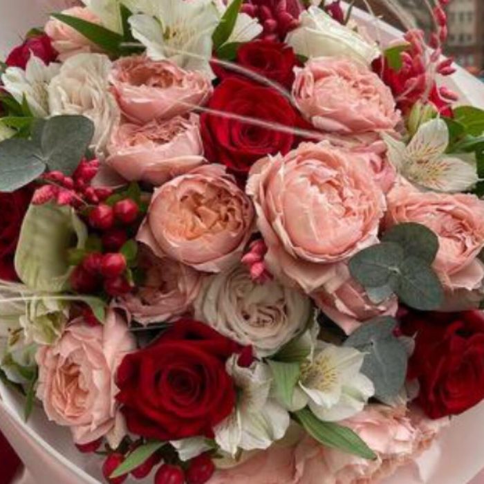 Альстромерия – 7 шт.Красная роза – 9 шт.Пленка матовая – 2 шт.Red Piano роза – 4 шт.джульетта роза пионовидная – 7 шт.Фоамиран (упаковка) – 2 шт.бриза сухоцвет – 10 шт.white o’hara – 3 шт.