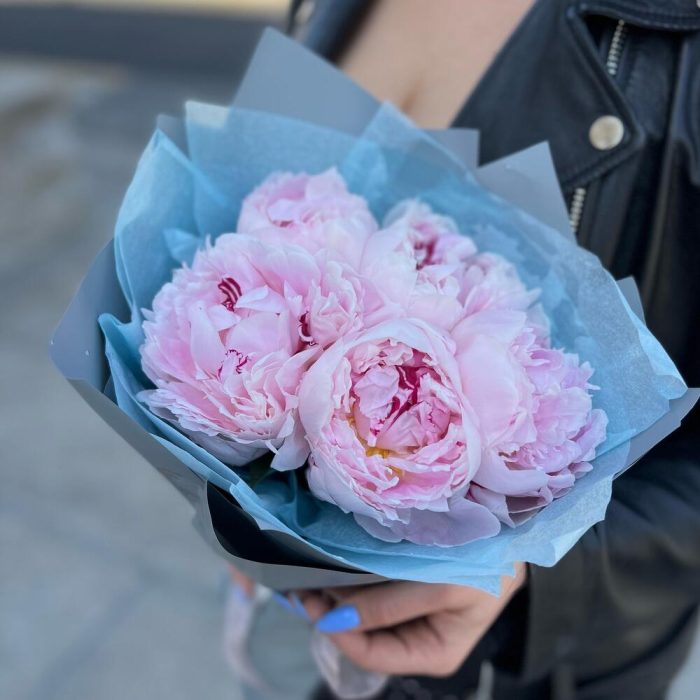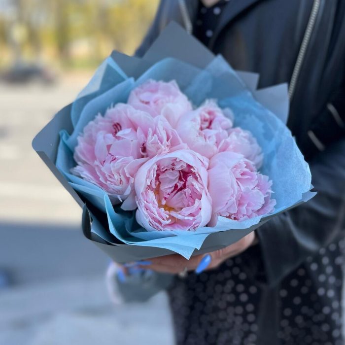 Пион Сара Бернар – 5 шт.Дизайнерская упаковка – 1 шт.Упаковка тишью – 1 шт.Атласная лента – 1 шт.крафт конверт – 1 шт.подкормка для срезанных цветов – 1 шт.инструкция по уходу за цветами – 1 шт.аквапак с водой – 1 шт.