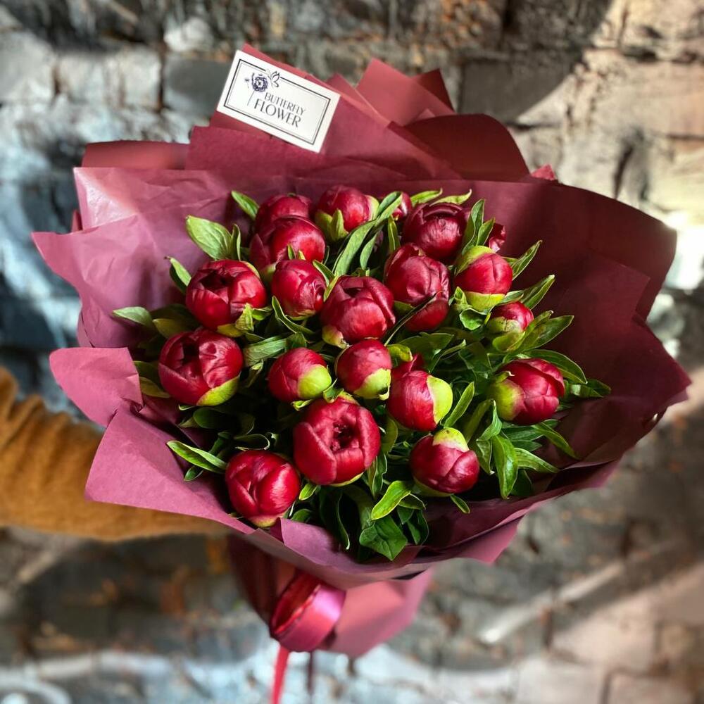 Букет из 17 бордовых пионов в дизайнерской упаковке “Ванда Вижн”