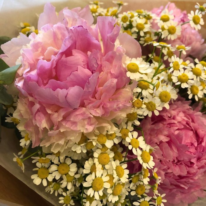 Пион – 3 шт.Матрикария (Ромашка Камила) – 5 шт.Эвкалипт – 1 шт.упаковка подарочная с лентой – 1 шт.Средство для продления жизни цветов – 1 шт.