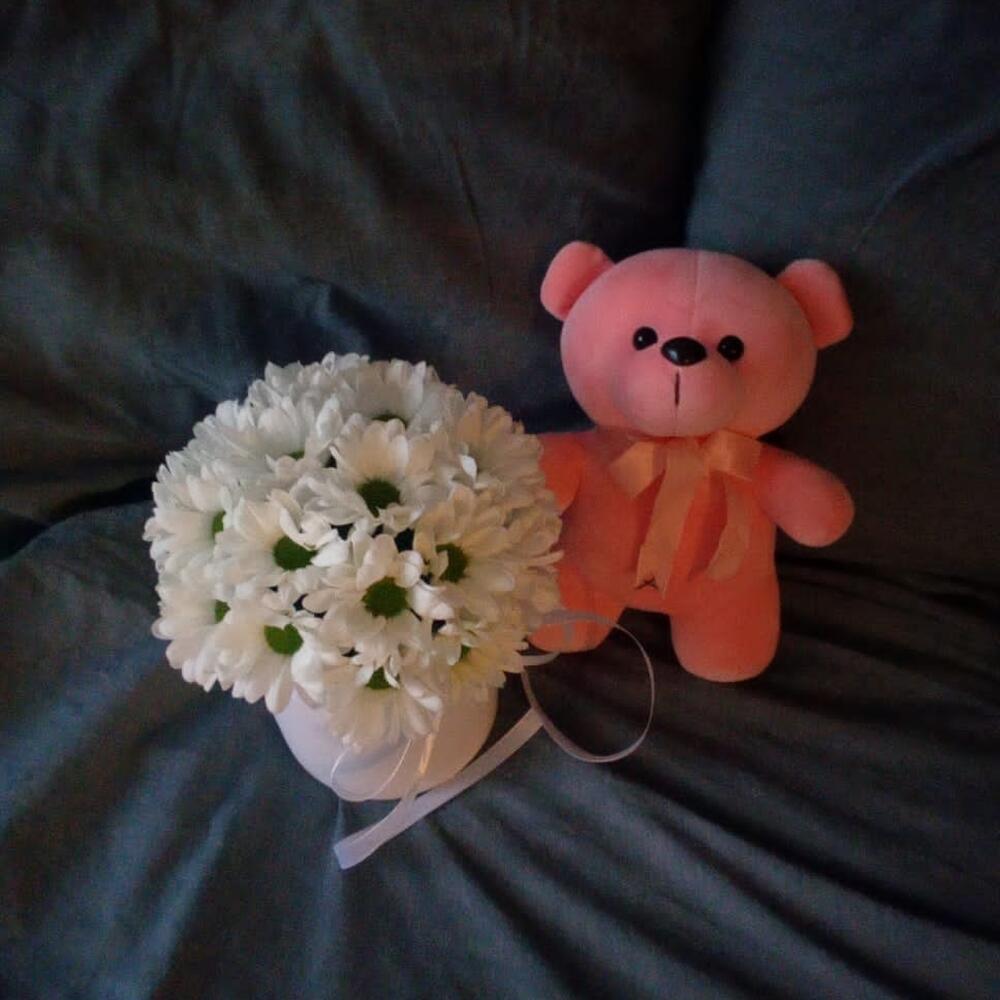 ромашки – 17 шт.Шляпная коробка – 1 шт.Пакет подарочный – 1 шт.Мишка плюшевый – 1 шт.Флористическая губка – 1 шт.