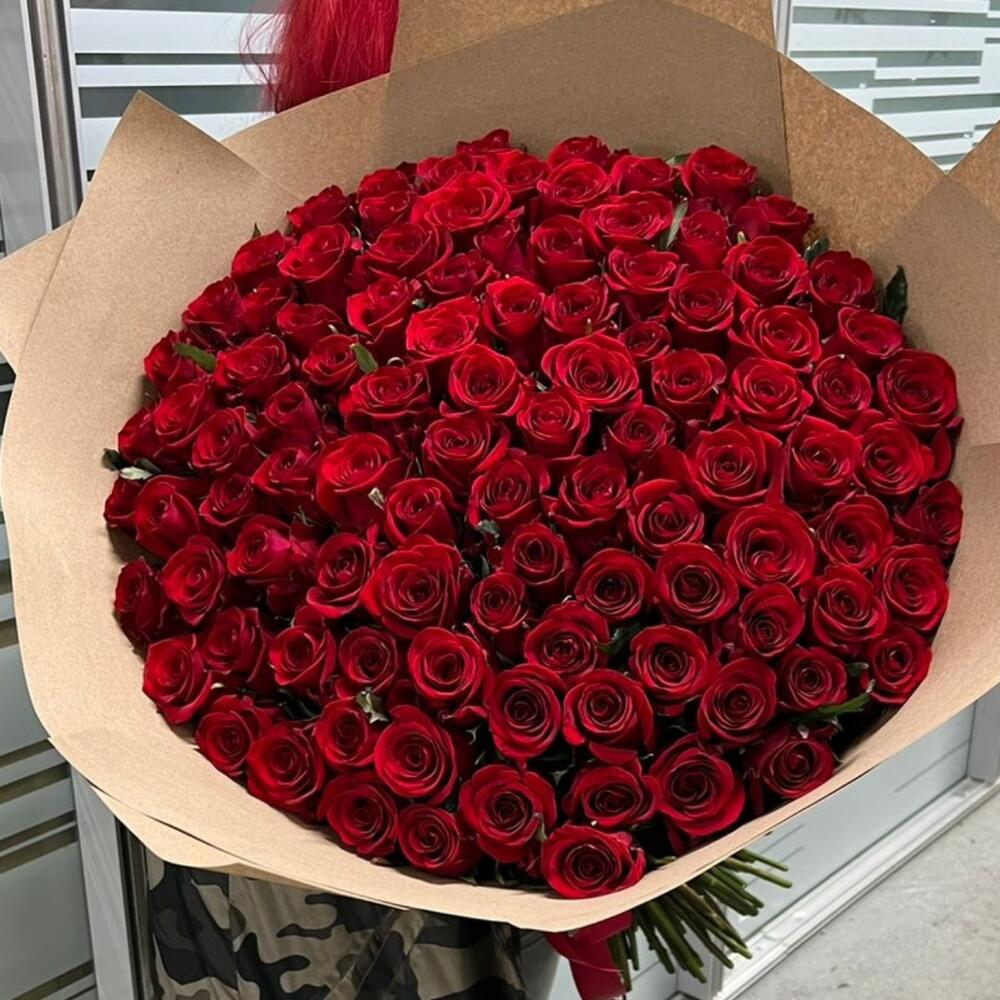 Лента атласная – 2 шт.Крафт – 5 шт.роза премиум красная 70 см – 101 шт.
