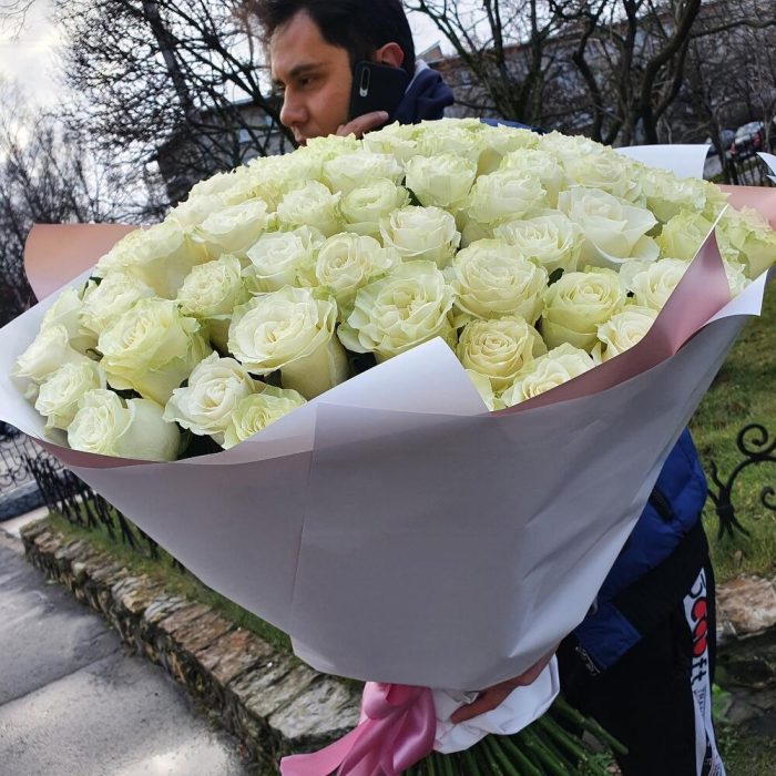 Роза эквадор премиум 80 см – 101 шт.Упаковка дизайнерская – 1 шт.Лента атласная – 1 шт.