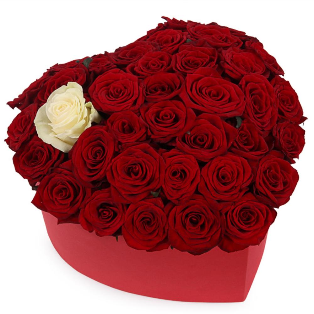 Роза красная – 34 шт.Роза белая – 1 шт.Коробка в виде сердца – 1 шт.Оазис флористический – 3 шт.