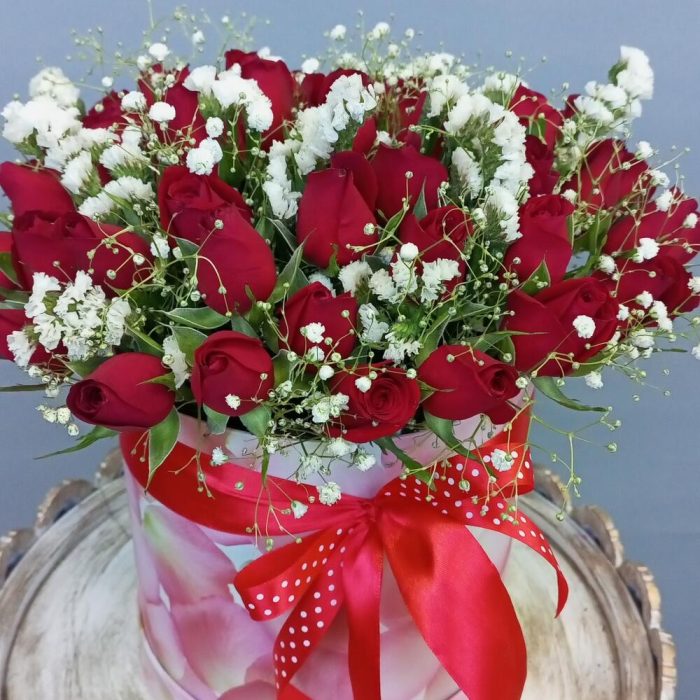 Гипсофила – 3 шт.Статица – 3 шт.Лента атласная – 2 шт.Коробка шляпная – 1 шт.Оазис флористический – 1 шт.роза кения – 51 шт.