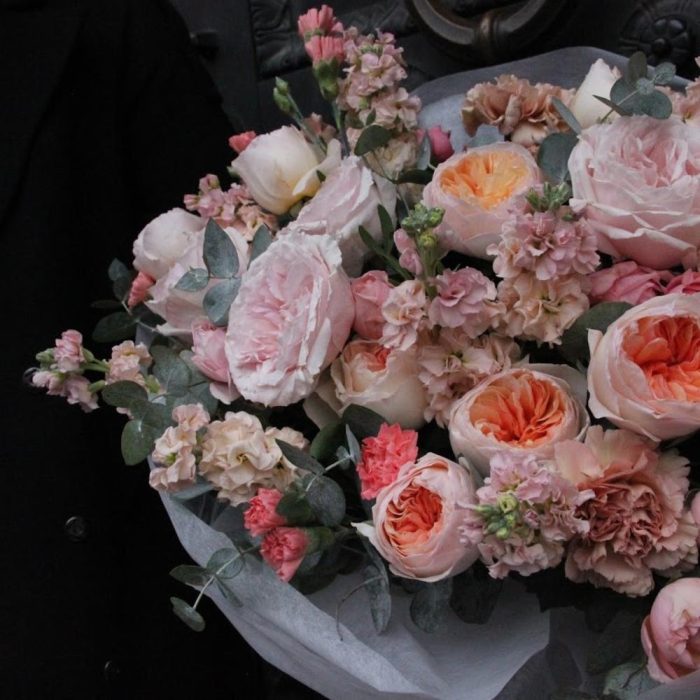 Роза пионовидная – 13 шт.Маттиола – 9 шт.Гвоздика – 7 шт.Гвоздика кустовая – 5 шт.Роза кустовая пионовидная – 3 шт.Эвкалипт – 7 шт.Бумага – 2 шт.Тишью – 3 шт.Лента атласная – 2 шт.