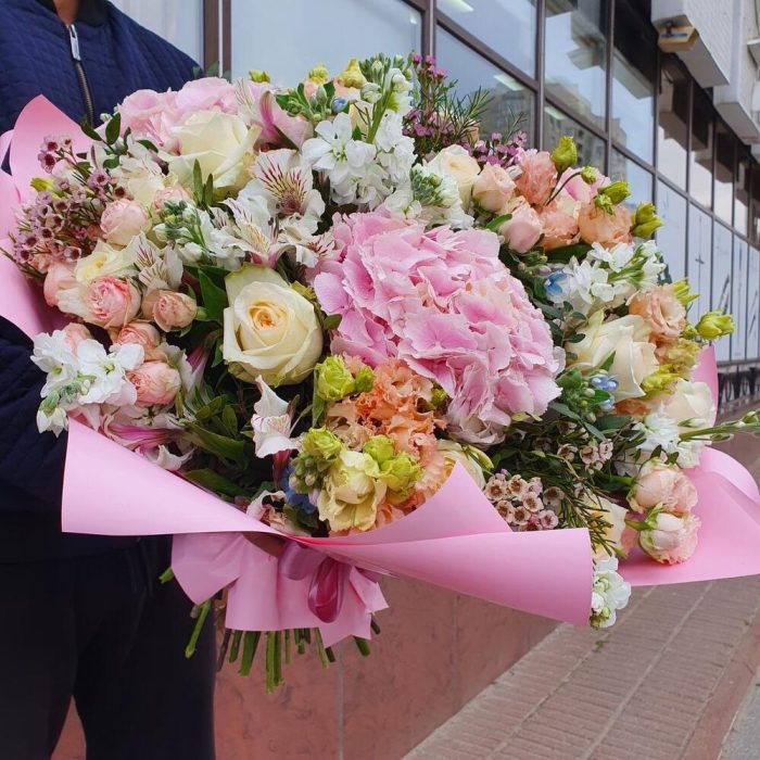 Гортензия розовая – 3 шт.Альстромерия – 10 шт.Маттиола – 10 шт.Лизиантус – 10 шт.Кустовая роза – 10 шт.Твидия – 12 шт.Роза Эквадор – 15 шт.Ваксфлауэр – 5 шт.Фисташка – 10 шт.Упаковка дизайнерская – 2 шт.