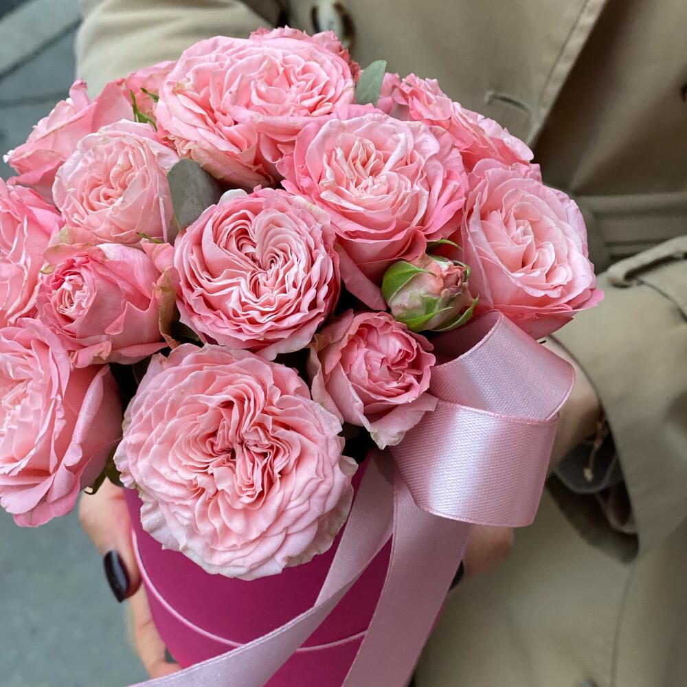 Роза кустовая Бомбастик – 3 шт.Эвкалипт – 2 шт.Шляпная коробка с лентами – 1 шт.