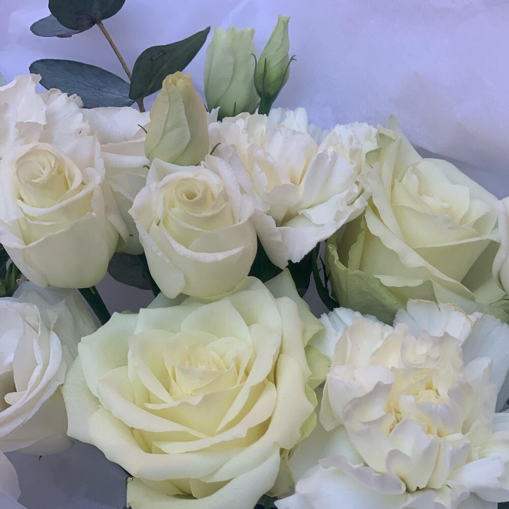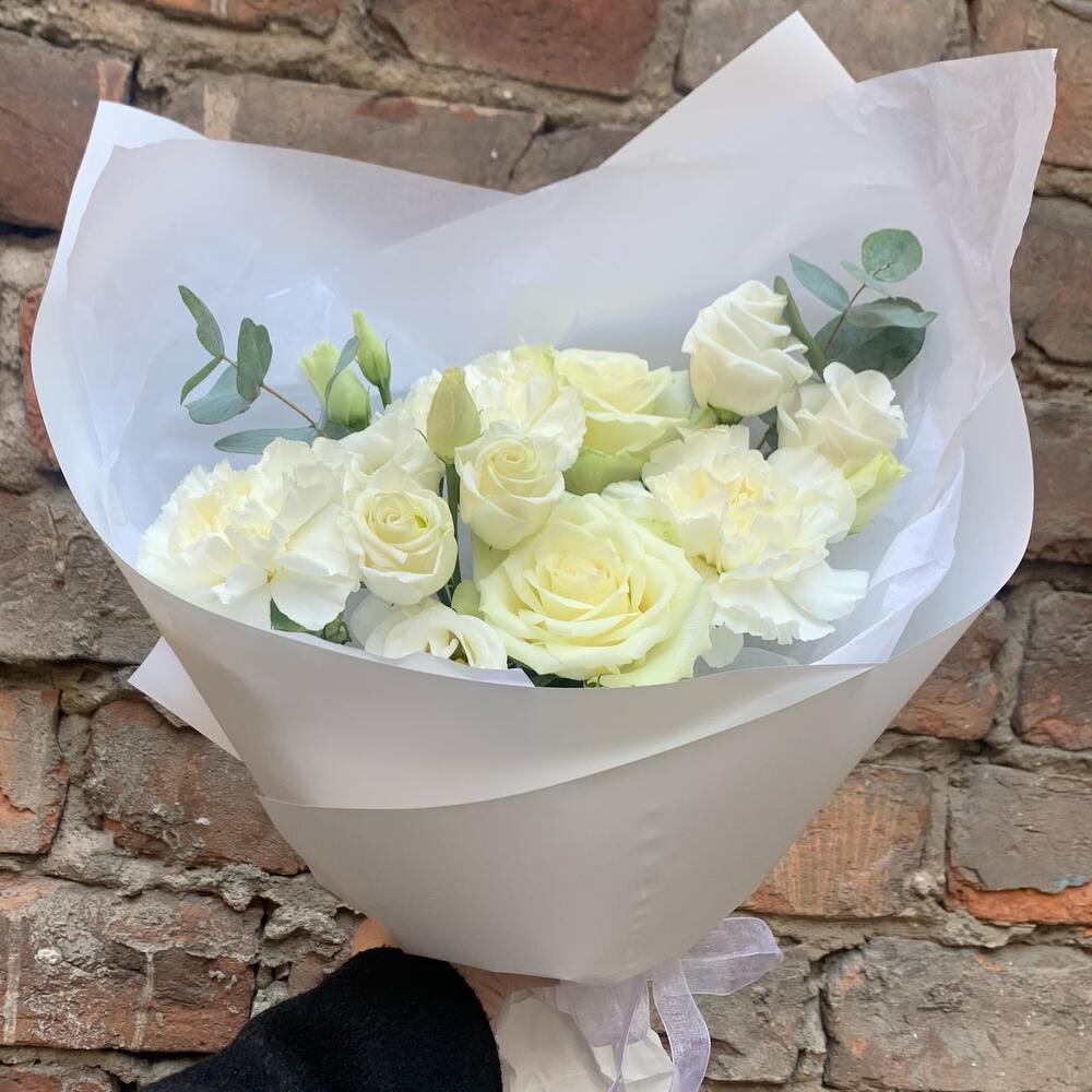 Белоснежный букет с гвоздикой и розой