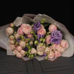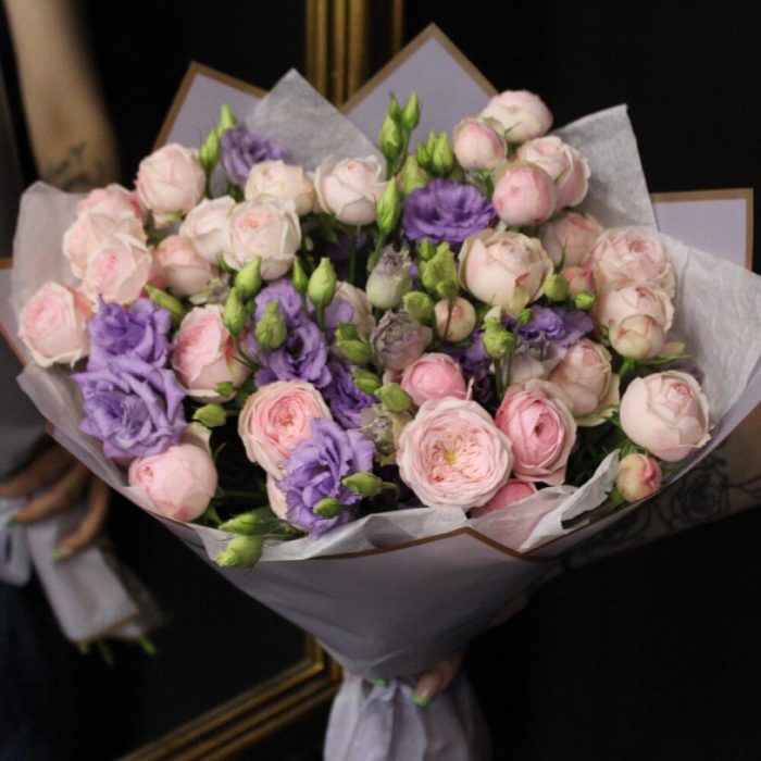 роза пинк менсфилд – 7 шт.эустома лавандовая – 5 шт.Тишью – 2 шт.Пленка матовая – 3 шт.Лента атласная – 2 шт.