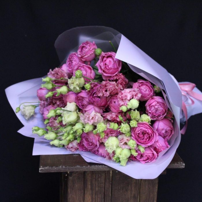 Лента атласная – 1 шт.эустома махровая – 11 шт.Пленка дизайнерская – 2 шт.роза кустовая пионовидная misty bubbles – 8 шт.