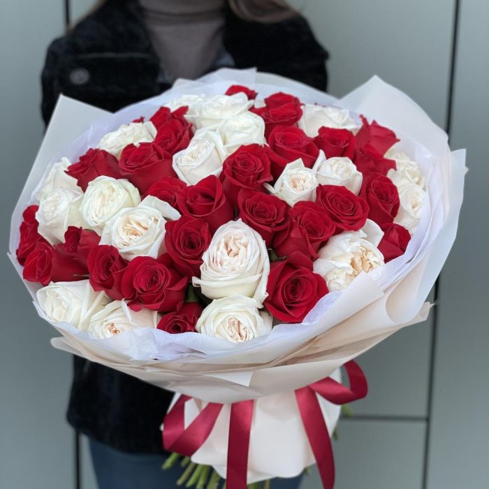 роза красная freedom – 31 шт. роза ohara – 20 шт. Оформление – 1 шт.
