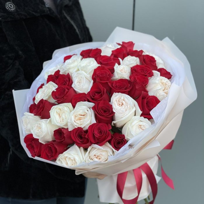 Букет из ароматных пионовидных и красных роз в оформлении!