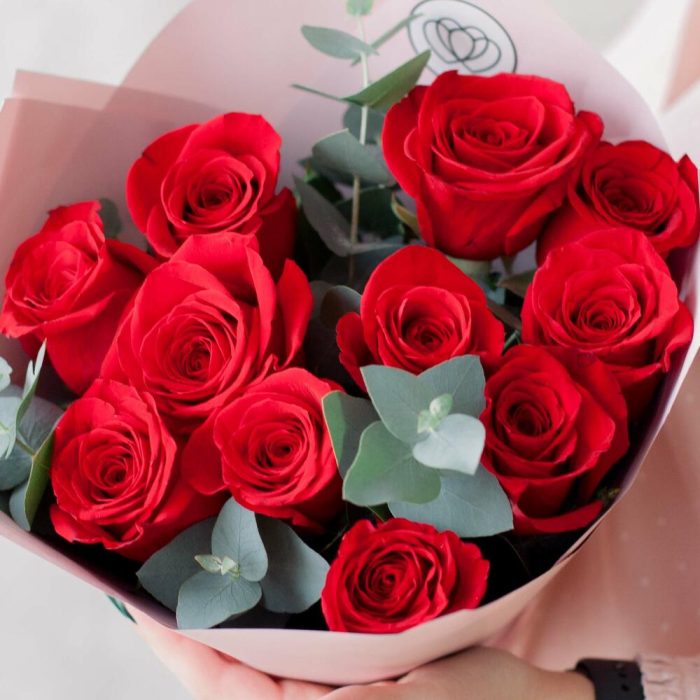 Эвкалипт – 3 шт.красные розы (эквадор) 50 см freedom – 11 шт.