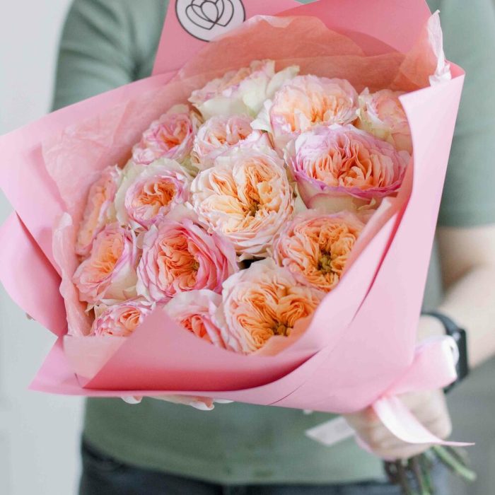 Букет из 15 персиковых пионовидных роз Flash Back 40 см
