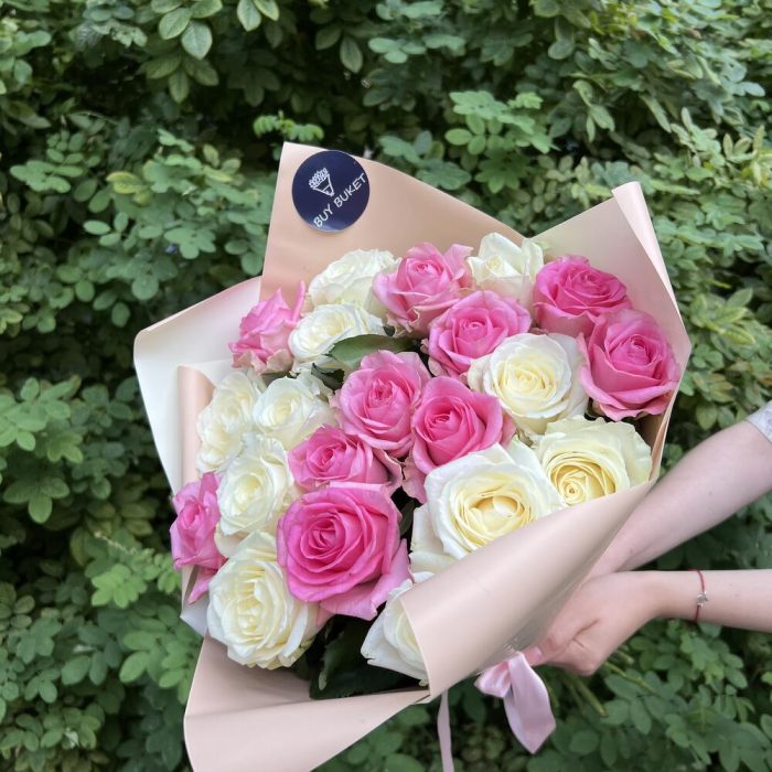 белая роза – 10 шт.Розовая роза – 11 шт.пленка цветная – 2 шт.Лента атласная – 1 шт.
