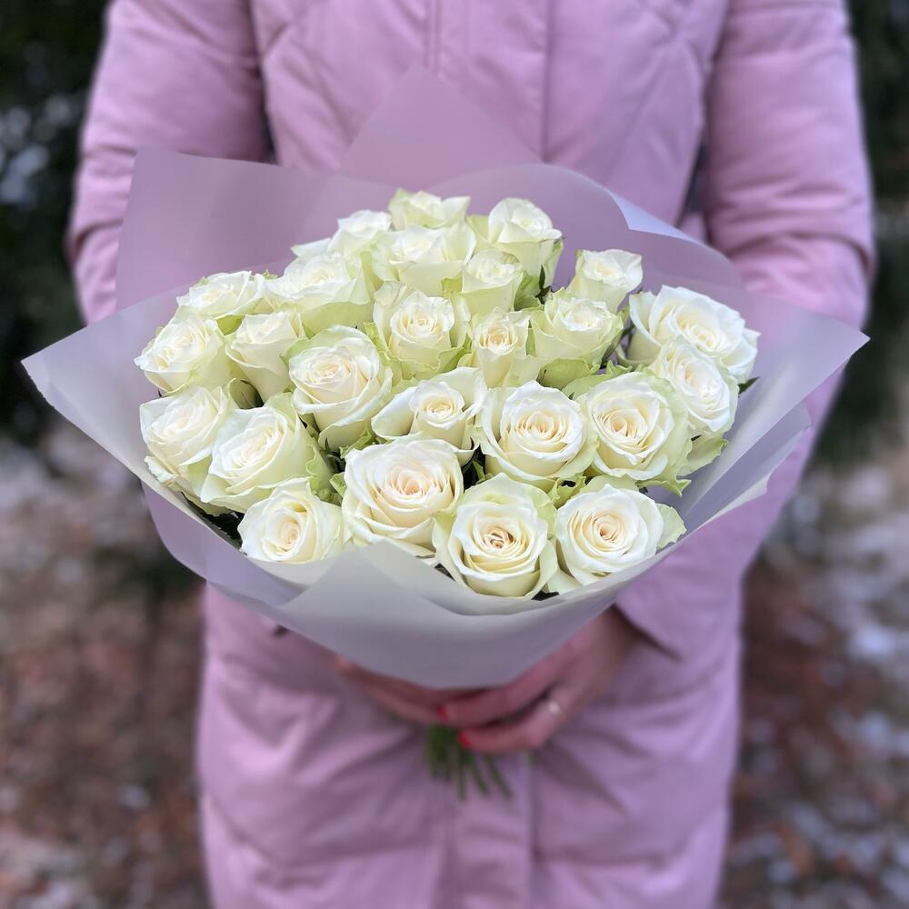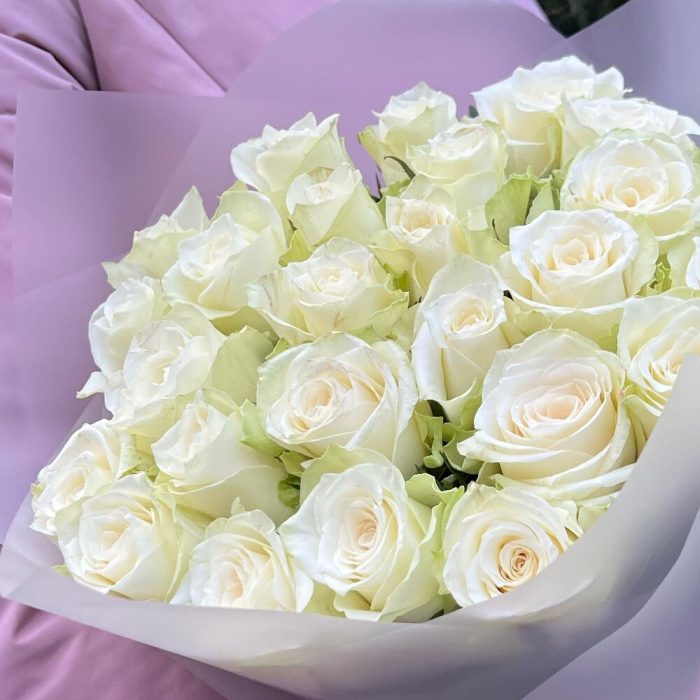 Роза белая – 25 шт.Пленка матовая – 1 шт.Лента атласная – 1 шт.