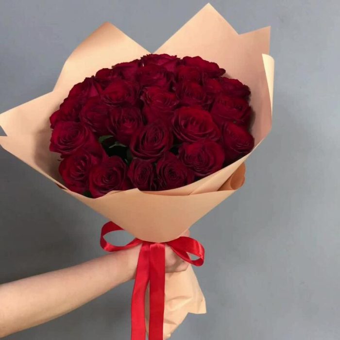 Букет из 25 красных роз в упаковке