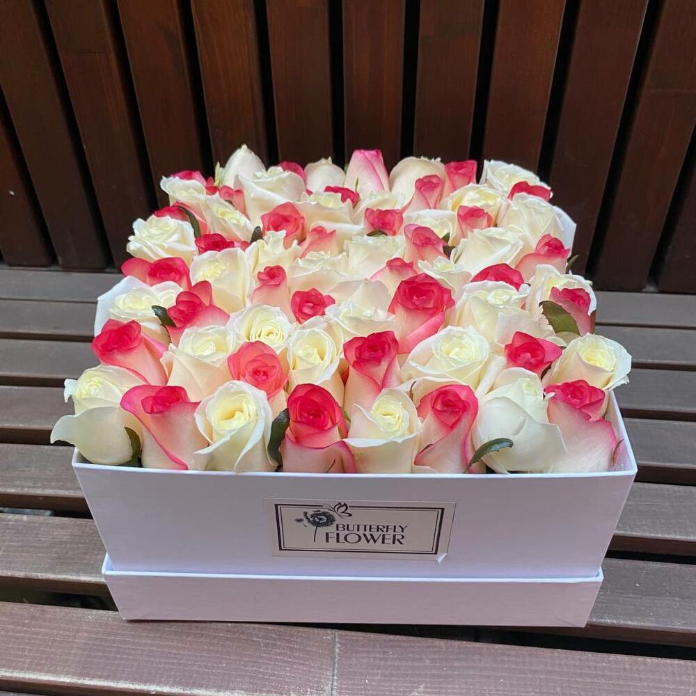 Букет из 65 розовых и белых роз в дизайнерской коробке “Ароматные шахматы”