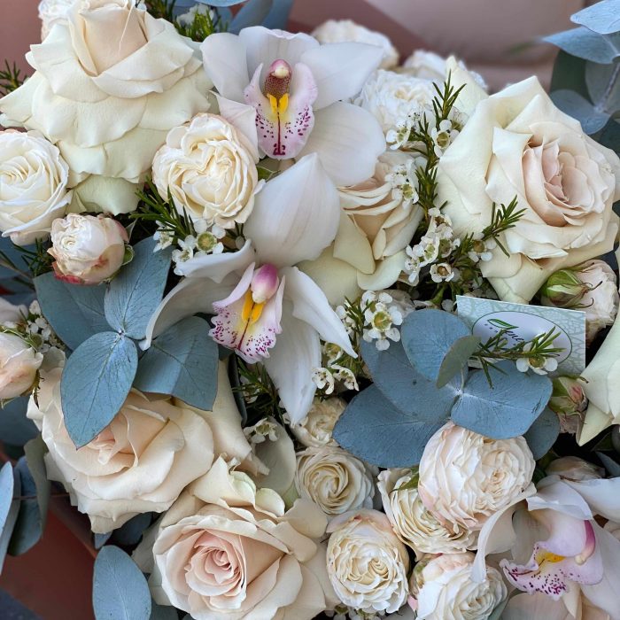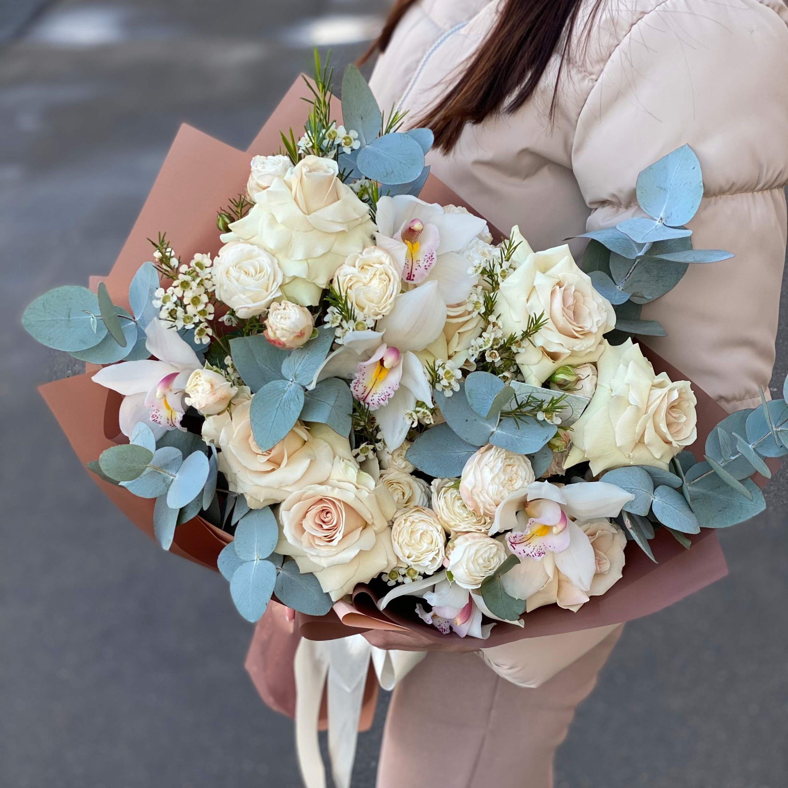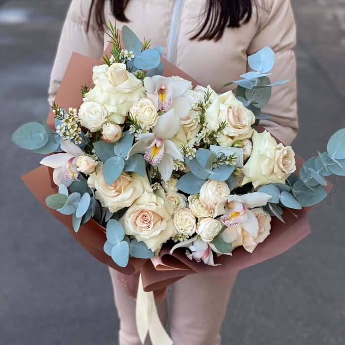 Альстромерии, Гвоздики, Кустовые розы, Лизиантусы, Розы, Хризантемы