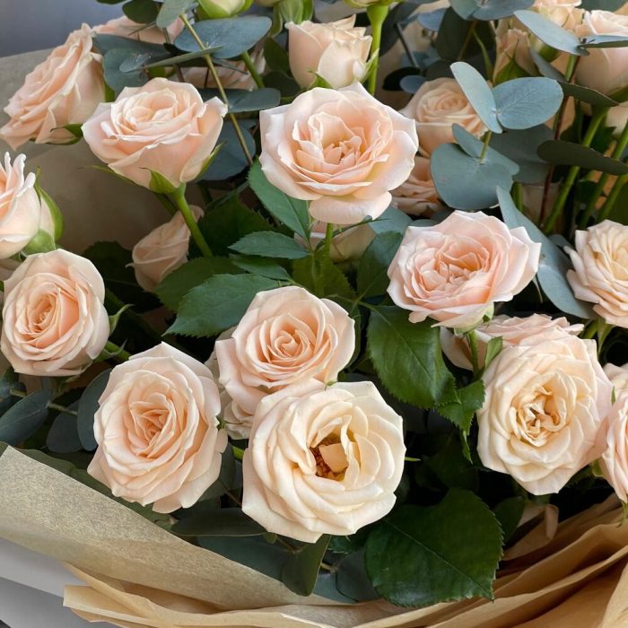 Эвкалипт – 2 шт.Кустовая роза – 11 шт.Лента атласная – 2 шт.Упаковка дизайнерская – 2 шт.