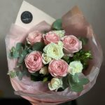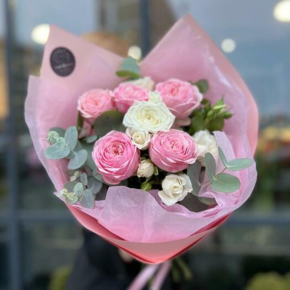 Пионовидная роза кустовая – 2 шт.кустовая роза жанин – 2 шт.Эвкалипт – 3 шт.декоративная упаковка – 2 шт.Атласная лента – 2 шт.